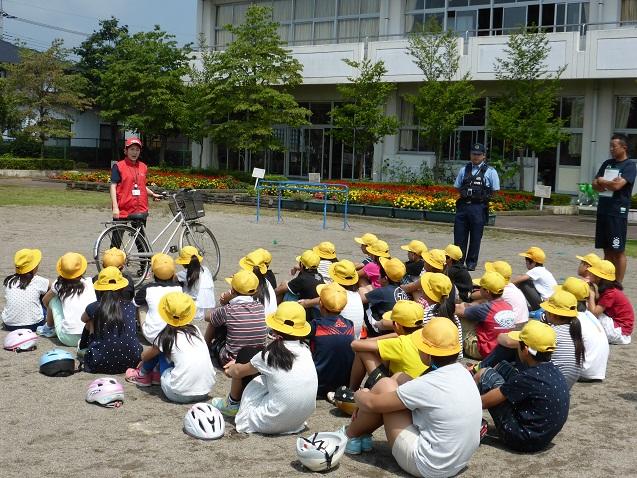 自転車については、「乗り方」「ブレーキの使い方」「自転車の点検 ブタがシャベル」の3点についての話がありました。児童は、背面で行われていたシートベルトコンピンサーの音にも惑わされず、しっかりと指導を受けていました。