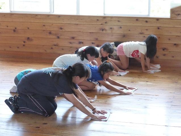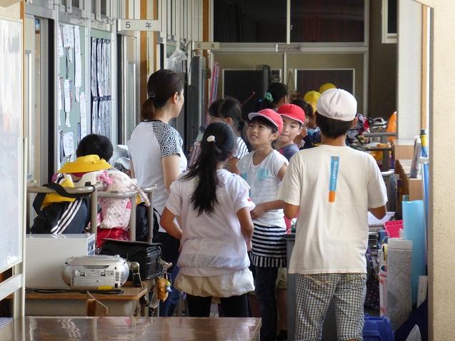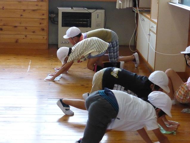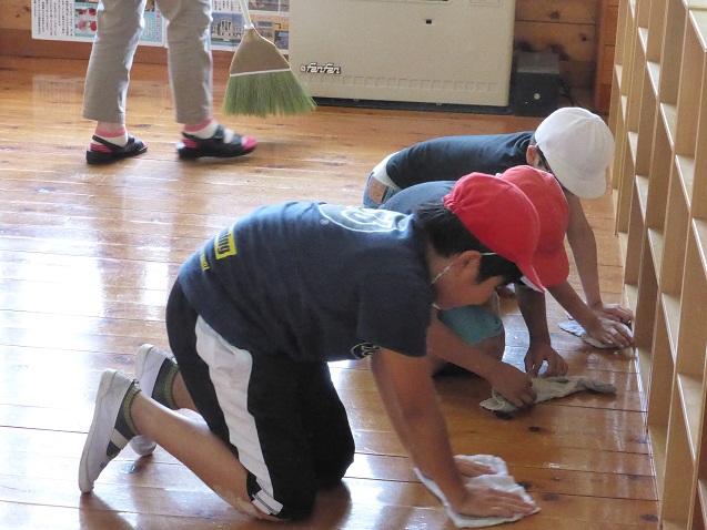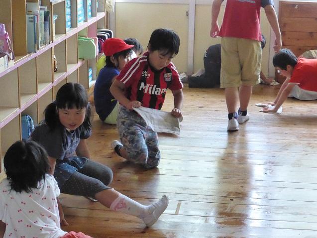 通常なら昼休み後に行う清掃を帰りの会の前に行い、教室にあるものをすべて廊下に出した後、水拭きを行いました。高学年の児童は自分の教室だけでなく、1年生や2年生の教室の手伝いや特別教室等も分担して水拭きを行いました。高学年になると作業も丁寧になり、壁やロッカーがある隅の部分まで丁寧に水拭きをしていました。教室が使えないため、帰りの会は各学年とも廊下で行いました。児童はこの時点で下校なので、ワックスがけは教師が行いました。