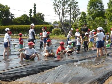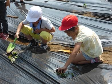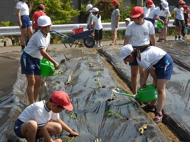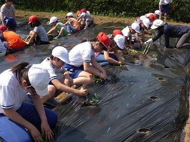 前日の22日に、PTAひまわり委員会で畝を立ててマルチシートを設置してくださったので、児童たちは用意しておいたサツマイモの苗を、マルチシートの穴を開けた部分に植えていきました。「船底植え」「水平植え」「斜め植え」など、いくつかの植え方があるようですが、児童の植えている様子を見ていると、「船底植え」をしているつもりで「水平植え」や「斜め植え」になっているという感じでしょうか。