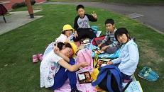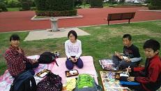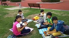 港公園での昼食風景です。港公園は鹿島港の中にあり、鹿島製鐵所のある鹿島臨海工業地帯に隣接しています。雨が上がったので、公園内でお弁当を食べることができました。このあとは、バスに乗り一路学校へ向かいます。