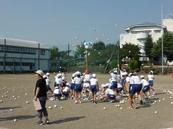 1校時は運動会の練習で、まり入れ、大玉転がし、応援合戦の隊形の確認を第2校庭で行いました。まり入れでは、2回のまり入れの合計で、赤が29個、白が36個となり、今回は白組の勝利でした。声を合わせて一斉にまりを投げ入れる方法と、それぞれがまりを投げ入れる方法のどちらがいいのでしょうか。