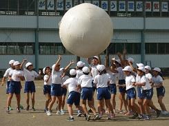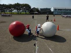 続いて大玉転がしでは、初め白組が優勢でしたが、途中から赤組が追い抜き勝利しました。自分の背丈もある大きな玉を転がす1年生2年生の姿や、持ち上げて頭上で運ぶ3年生以上のダイナミックな姿が見応えがある競技だと思います。