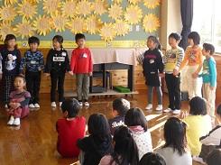 10月25日の朝、1年生が国語の教材にある「くじらぐも」の音読を、物語の中に登場する1年2組の子どもの役をする児童、くじらぐもの役をする児童、ナレーションの役をする児童の役割分担で音読しました。音読の途中では、場面に合せて合唱をしたり、みんなで雲に乗るためにジャンプをしたりするなど、手振り身振りを交えながらの楽しい音読劇でした。
