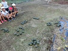 校舎北側の農園で、ミニカボチャがたくさんできました。昨日5時間目、1年生に収穫してもらいました。たくさんあって、見つけるたびに歓声をあげ、上手に収穫することができました。収穫の後は何個あったか数えることに。思い思いに10ずつまとめて、みんなで数えました。