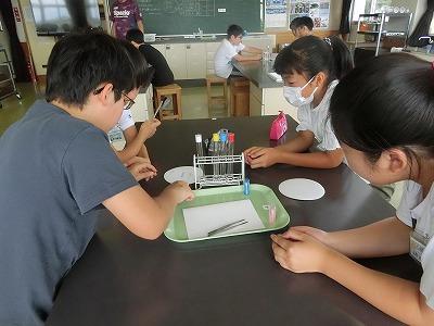 台風15号のため2時間遅れで、授業を行いました。1年教室では楽しい英語の授業です。いろいろなスポーツを英語で言ってみようと頑張っていました。理科室では、6年生が、水溶液の性質の学習です。とても慎重に試験管から、溶液を取り出していました。