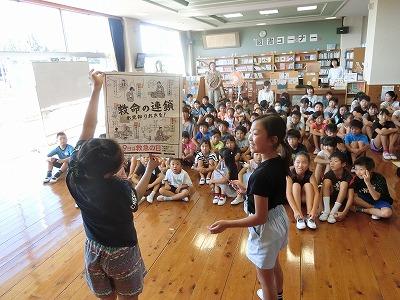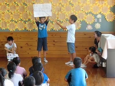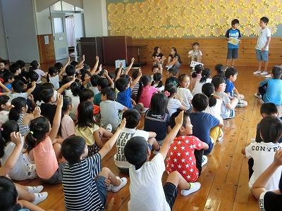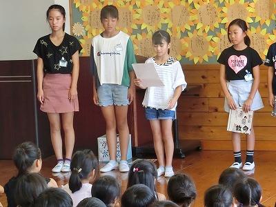 今日の朝の活動は、放送委員会による集会活動でした。歌詞の一部が書いてある紙を使って朗読し、その曲名を当てるというクイズです。正解が出ると曲が流れ、みんなで歌いだすという、素敵な集会でした。