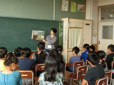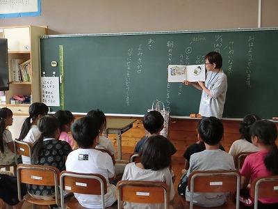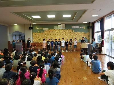 朝の集会活動は、3年生による音読発表会でした。国語の「もうすぐ雨に」を全員で分担して発表しました。大きな声で上手に発表できました。網戸にはさまったカエル役がいたり、「ちりん」と鳴る鈴の役がいたりと楽しい音読集会になりました。
