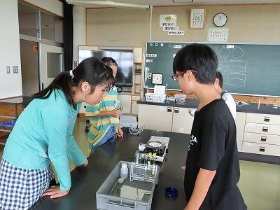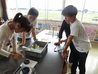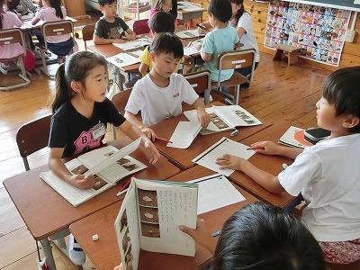1年生は自分のみつけた生き物を紹介する学習です。声をそろえて音読してから、何を書こうか相談していました。6年生は理科実験です。水溶液に溶けた金属の行方を調べるべく蒸発皿を使って実験です。1年生も6年生も一生懸命取りくんでいました。10月は気候も良く、学習にもとてもよい季節です。