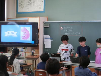 グループごとに調べたことをスライドにまとめ、協力して発表していました。人が生まれるまでの成長過程や染色体・栄養等についてなど、グループごとに少しずつ内容が異なり、イラストや表・グラフ等を上手に取り入れてまとめていました。