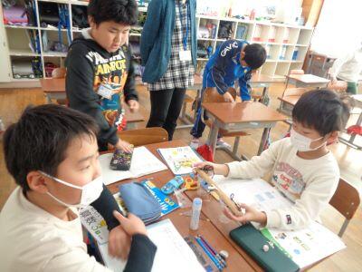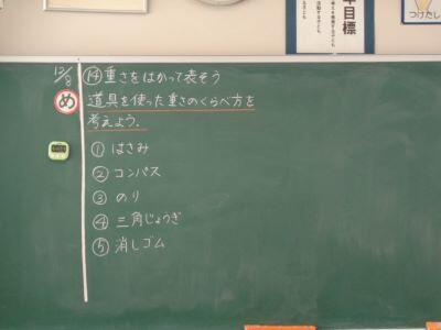 算数科の授業。道具を使って、重さを量りました。夢中になって取り組む子どもたちの姿が見られました