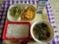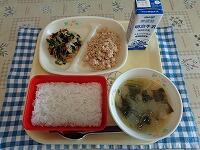 今日の献立は、「わかめごはん 鶏のから揚げ 菜の花のおひたし すまし汁 お祝いデザート 牛乳」でした。