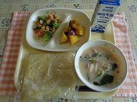 今日の献立は、「キムチうどん 春巻 ひじきとツナのナムル 牛乳」でした。