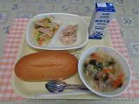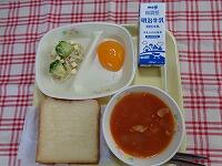 今日の献立は、「フルーツクリームパン トマトミートオムレツ 野菜スープ 牛乳」でした。