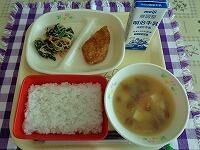 今日の献立は、「ごはん ガーリックチキン 磯辺あえ 豆乳仕立ての野菜汁 牛乳」でした。