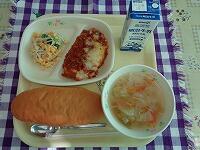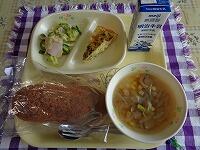 今日の献立は、「牛乳パン ミートソースグラタン コーンサラダ 野菜スープ 牛乳」でした。