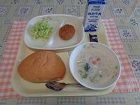 今日の献立は、「コロッケサンド 海藻サラダ ほうれん草のクリームスープ 牛乳」でした。