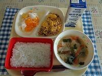 今日の献立は、「ごはん ミンチカツ ひじきとチーズのあえもの 豆乳仕立ての野菜汁 牛乳」でした。