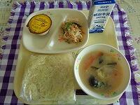 今日の献立は、「和風ビビンバ ワンタンスープ 杏仁豆腐 牛乳」でした。
