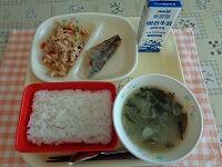 今日の献立は、「ごはん いわしのごまみそ煮 かんぴょうのサラダ 沢煮椀 牛乳」でした。