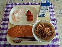 今日の献立は、「はちみつパン 野菜肉団子 焼きそば フルーツヨーグルトあえ 牛乳」でした。
