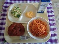 今日の献立は、「ココアパン オムレツ イタリアンサラダ ナポリタンスパゲティ 牛乳」でした。
