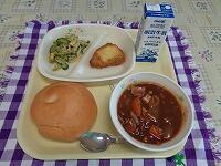 今日の献立は、「バターロール チキンオーブン焼き アスパラサラダ ブラウンシチュー 牛乳」でした。