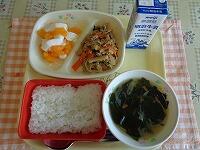 今日の献立は、「わかめごはん 鶏のから揚げ ポテトサラダ 五目みそ汁 牛乳」でした。