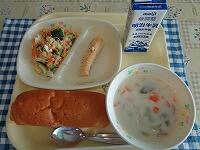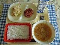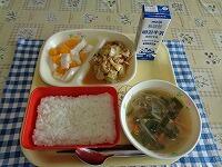 今日の献立は、「ごはん モロのあっぷるソース かんぴょうのごまあえ 豆乳仕立ての野菜汁 牛乳」でした。