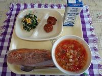 ラタトゥイユは、フランス南部で作られている野菜を使った煮込み料理のことをいいます。給食では、ベーコン、玉ねぎ、ピーマン、ズッキーニ、にんじんなどで作りました。ハンバーグと一緒に食べました。