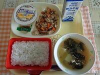 わかめごはんと鶏のから揚げは、子どもたちにとても人気があります。わかめは海藻の仲間です。海藻には食物繊維がたくさん含まれていてお腹のお掃除をしてくれるはたらきがあります。栄養たっぷりのわかめがたっぷり入ったごはんを今日もよく食べていました。