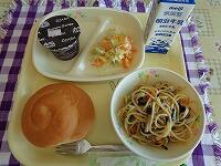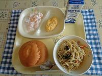今日の献立は、「バターロール オムレツ 和風スパゲティ フルーツヨーグルト 牛乳」でした。