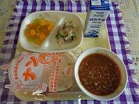 みなさんに人気のあるフルーツクリームが出ました。今回は、みかんやパイナップル、桃が使われていました。スライスされたコッペパンにはさんで食べてました。今日は、食べやすいメニューでしたので残さないで食べていた児童がたくさんいました。