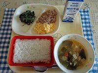 みなさん人気の三色丼が出ました。麦ごはんの上に、肉そぼろ(茶色)・入り卵(黄色)・おひたし(緑)を乗せて食べました。今日は、食べやすいメニューでしたので、よく食べていました。完食している人がたくさんいました。