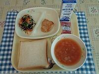 今日の献立は、「ビスキュイパン トマトつけ汁うどん ブロッコリーサラダ チーズ 牛乳」でした。