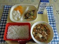 今日の献立は、「ごはん 麻婆豆腐 小松菜のナムル 杏仁豆腐 牛乳」でした。