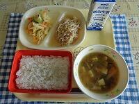今週は、栃木県産の食材をたくさん使った給食が出ます。栃木県産の米・豚肉・たまねぎ・にんじん・ごぼう・こんにゃく、もやし、きゅうり、豆腐、なめこ・みつば・ねぎ・みそ・牛乳を使っていました。中でも米ときゅうり・みつばは矢板市産、豚肉はさくら市産でした。