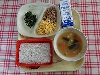 今日の献立は、「和風ビビンバ丼 もやしのさっぱりあえ かんぴょうスープ 牛乳」でした。