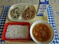 今日の献立は、「ごはん 豚肉のしょうが焼き ほうれん草のツナマヨあえ けんちん汁 牛乳」でした。