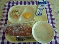 今日の献立は、「ココア揚げパン ミニオムレツ イタリアンサラダ ベーコンチャウダー 牛乳」でした。