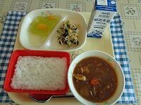 今日の献立は、「ごはん ひき肉とまいたけのカレー 海藻サラダ ゼリーあえ 牛乳」でした。