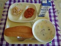 今日の献立は、「ごはん 豚キムチ炒め わかめと春雨のスープ 杏仁フルーツ 牛乳」でした。