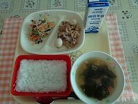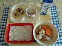 今日の献立は、「ごはん モロのケチャップあえ ゆかりあえ のっぺい汁 牛乳」でした。