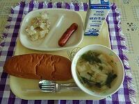 今日の献立は、「チーズパン いかのレモンバター焼き パリパリサラダ ニョッキのクリームスープ 牛乳」でした。