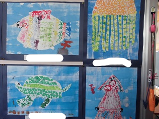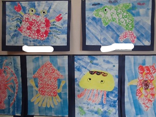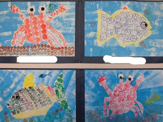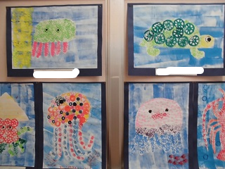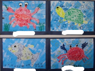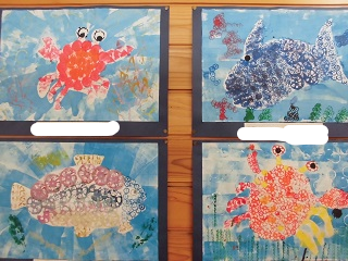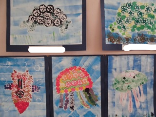 1年生がいろいろな物で形を写し、かわいい作品に仕上げました。写した形からイメージを膨らませ、自分が表したいことを楽しみました。