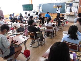 子どもたちは、先生の読み上げる漢字を真剣に聞き取り、ノートに漢字を書いていました。