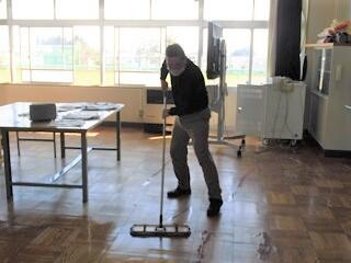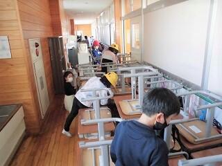 年度末になり、各教室では放課後にワックスがけが行われています。子どもたちも協力して、机や椅子を廊下に運び出します。そして、先生方がきれいにワックスをかけます。