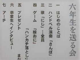 4・5・6組による「六年生を送る会」が、体育館で行われました。ハンドベル演奏・歌のプレゼント・「線おに」「ハンカチ落とし」等のゲームと、盛りだくさんの内容でした。