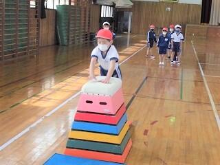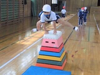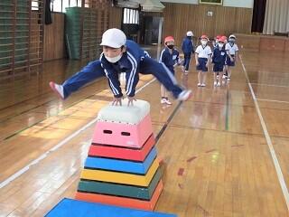 1年生の体育の様子。この日は跳び箱に取り組みました。三つの「場」が設けられています。