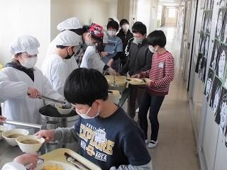 中学年の給食準備の様子。密の状態を回避するため、廊下で給食準備を進めています。また、テーブルクロスは毎日新しいものを持ってくるようにして、衛生状態を保っています。