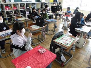 12月20日(火)伝統文化にふれることを目的とした、6年生による箏の体験教室が開かれました。箏の講師の先生をお迎えし、各クラス毎に1時間ずつ行われました。2人で1面ずつ箏を準備し、「さくら」の曲を練習しました。番号が書いてある譜面を見ながら、その番号の弦をはじくのに子どもたちは一生懸命でした。「番号を追うのが難しい!」「楽しかった!」「さくらの部分だけは完ぺきに弾けた!」など感想を教えてくれました。